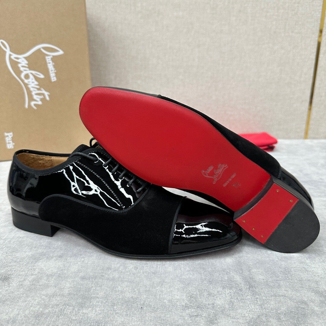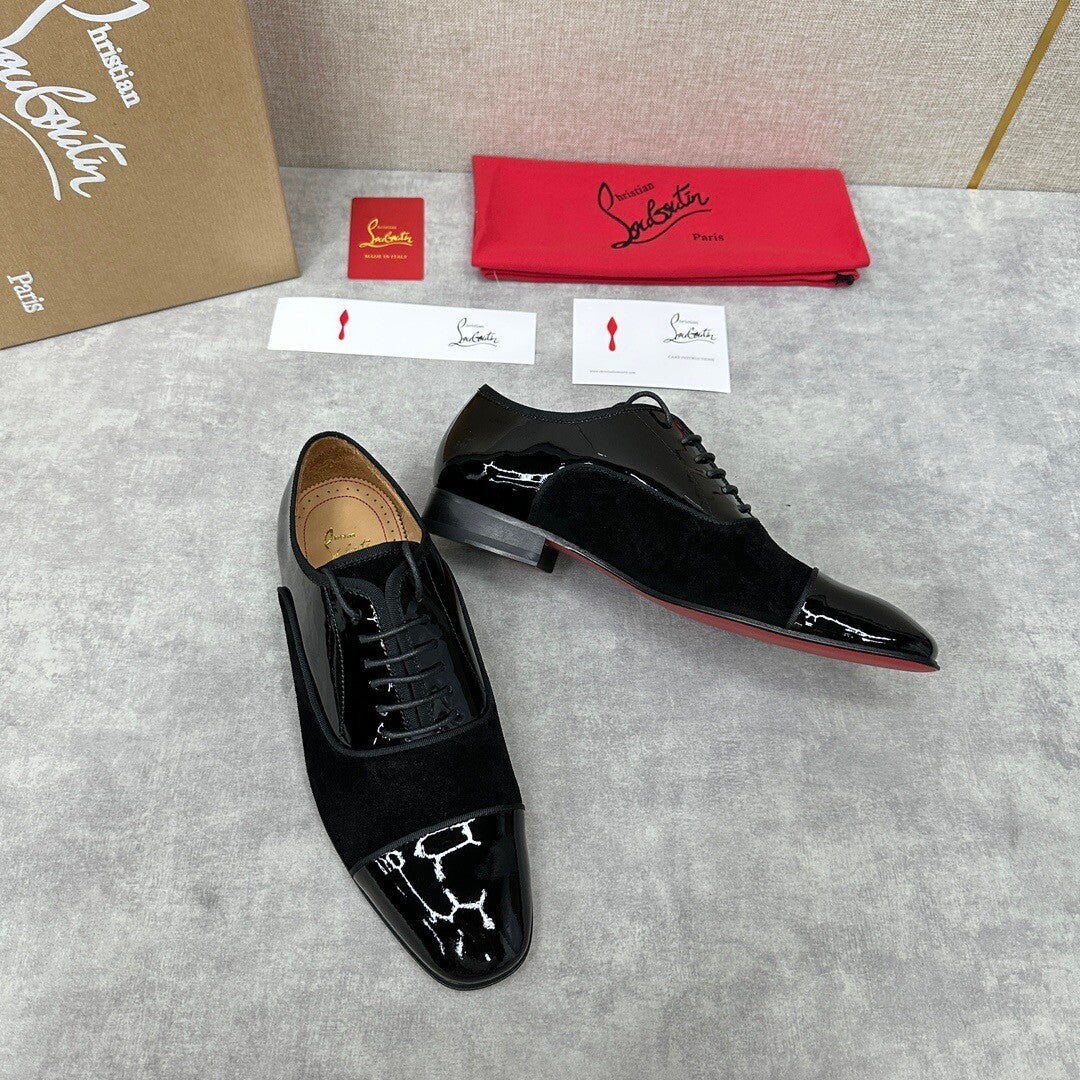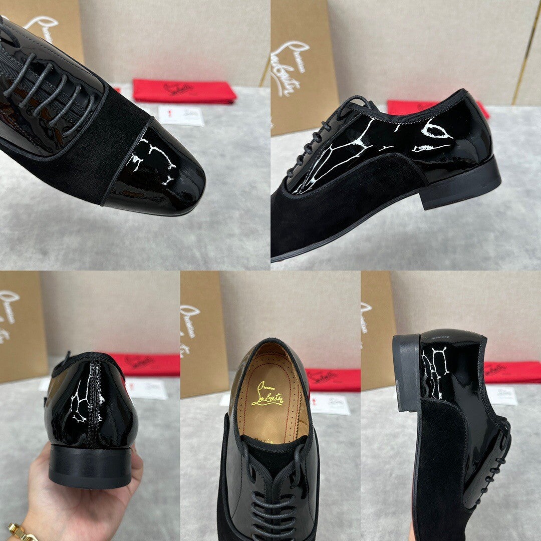 new formal shoes leather shoes Christia* Loubouti* red sole shoes GREGGO men's Oxford shoes official price RMB 600 made of imported cowhide/bright patent leather/stitched contrast color high mercerized anti-fur three-section design iconic Red outsole, extremely personalized shoes, original cowhide interior Italian original leather sole; fine workmanship brings you a luxurious experience, neat outline, GREGGO men's Oxford shoes are Oxford shoes born for urban roaming, elegant lines and classic contours exude eternal charm. The black patent leather material is exquisite and eye-catching, which adds a sense of advanced to the overall shape. The slender toe design is elegant, with closed shoelaces of the same color, which is exquisite and invisible. The slim sole design provides a light foot feeling, elegant pace, and presents an exquisite and elegant shape. It shows a great texture.