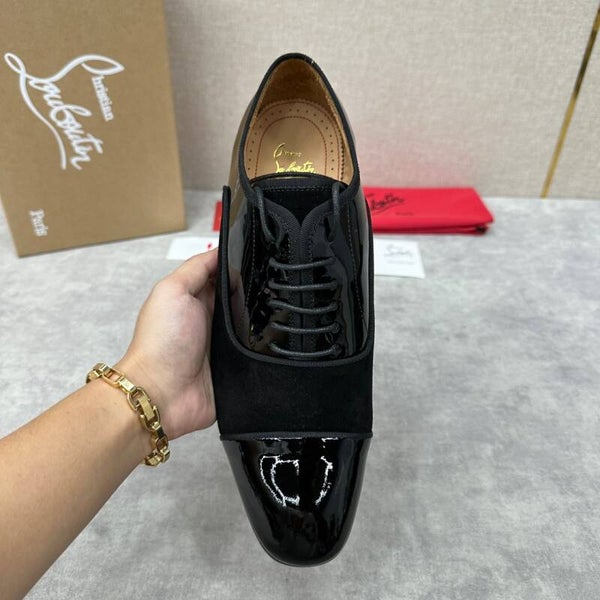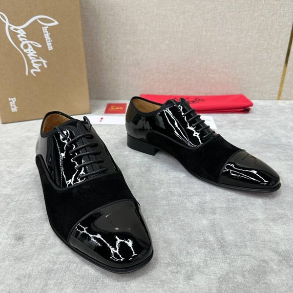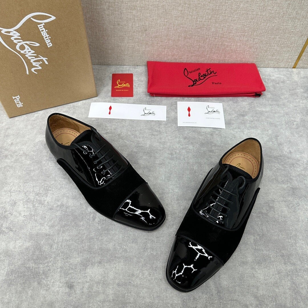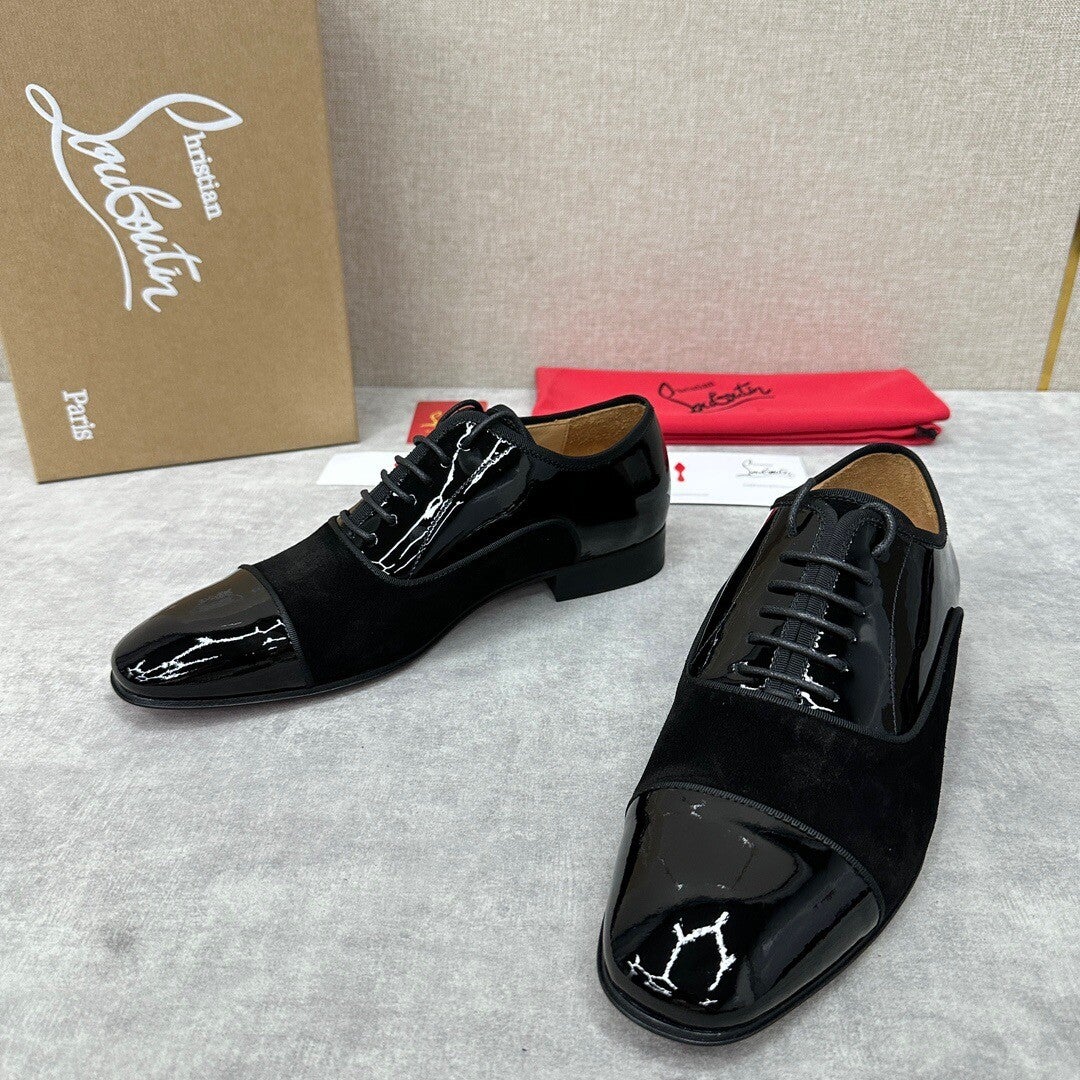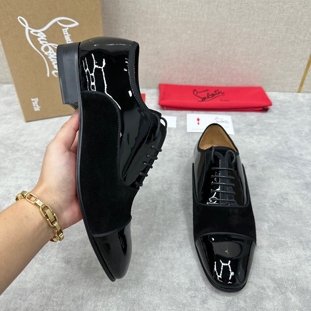 new formal shoes leather shoes Christia* Loubouti* red sole shoes GREGGO men's Oxford shoes official price RMB 600 made of imported cowhide/bright patent leather/stitched contrast color high mercerized anti-fur three-section design iconic Red outsole, extremely personalized shoes, original cowhide interior Italian original leather sole; fine workmanship brings you a luxurious experience, neat outline, GREGGO men's Oxford shoes are Oxford shoes born for urban roaming, elegant lines and classic contours exude eternal charm. The black patent leather material is exquisite and eye-catching, which adds a sense of advanced to the overall shape. The slender toe design is elegant, with closed shoelaces of the same color, which is exquisite and invisible. The slim sole design provides a light foot feeling, elegant pace, and presents an exquisite and elegant shape. It shows a great texture.